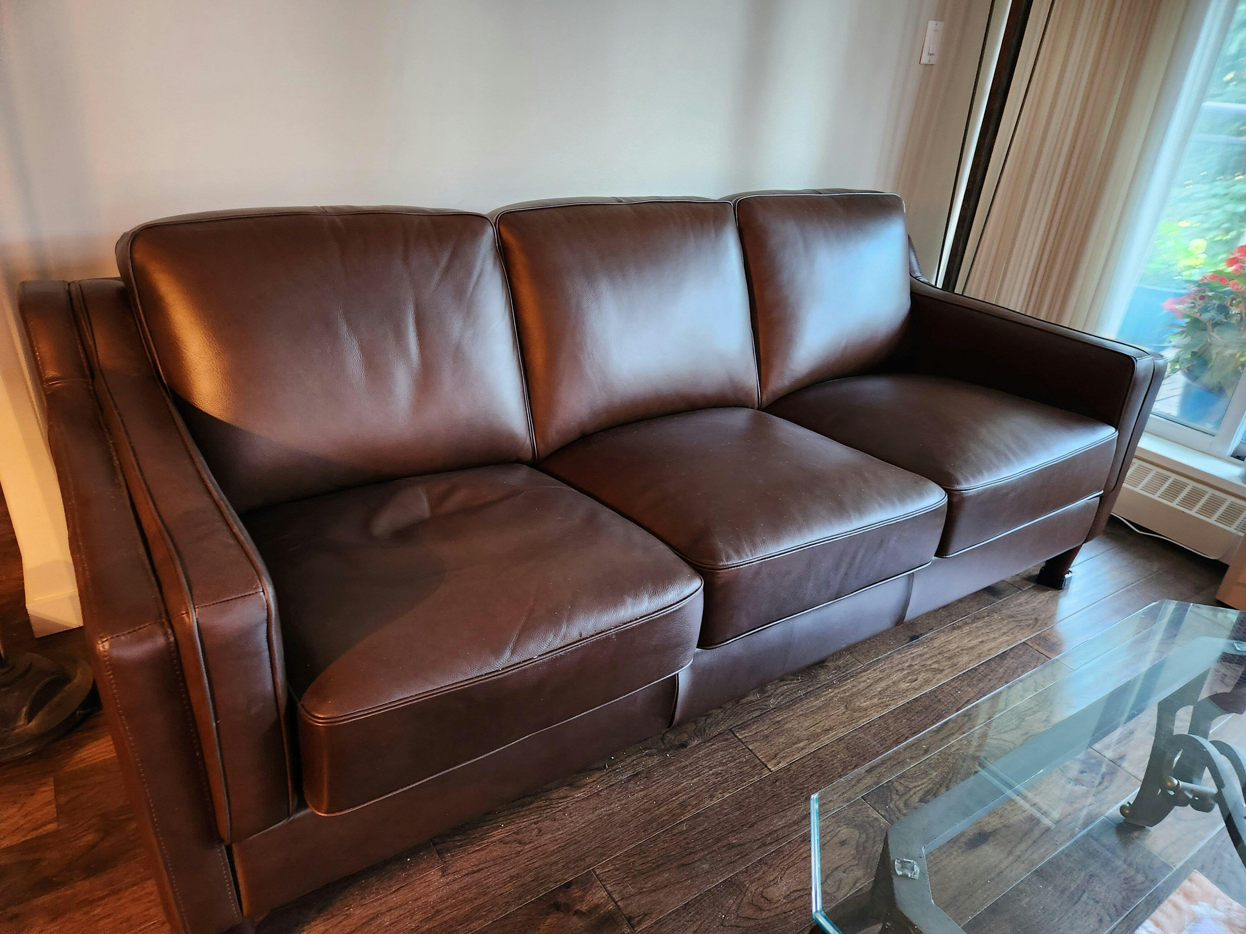 - Premium Leather: Top-grain leather is upholstered on the seating areas and armrests. Split-grain leather is used on the sides and back